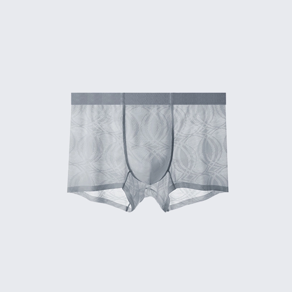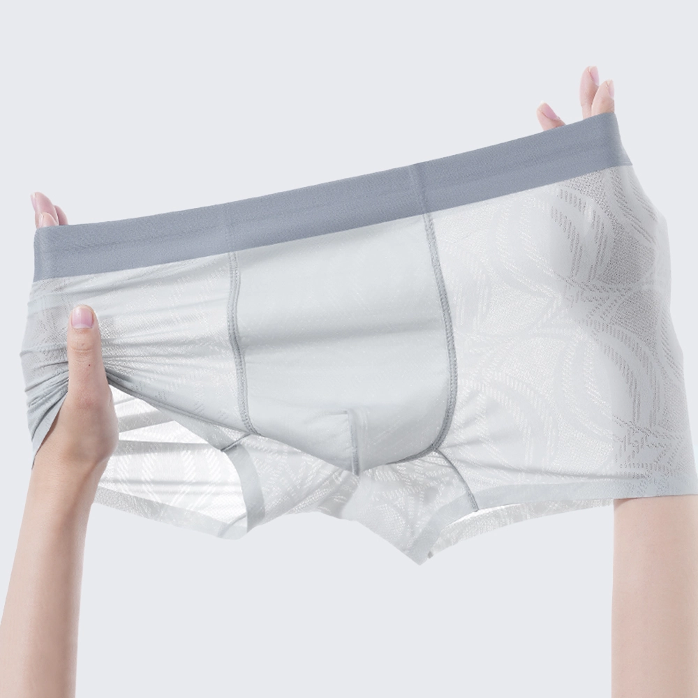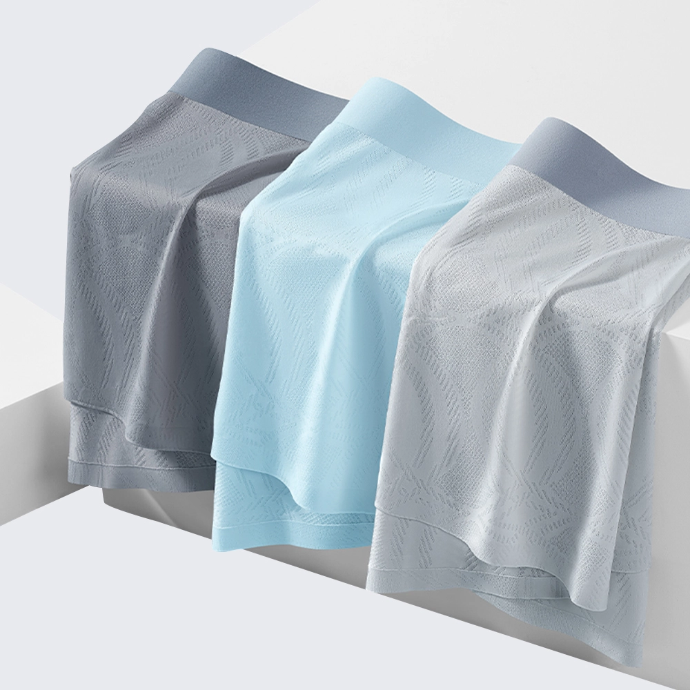 These men's boxer briefs feature ice silk fabric with antibacterial jacquard, offering breathable, quick-dry comfort for summer wear.