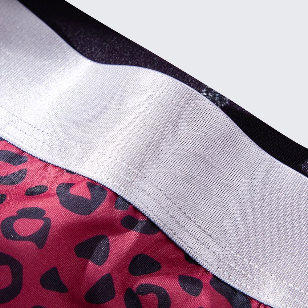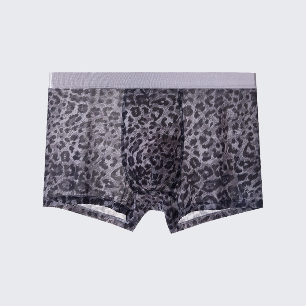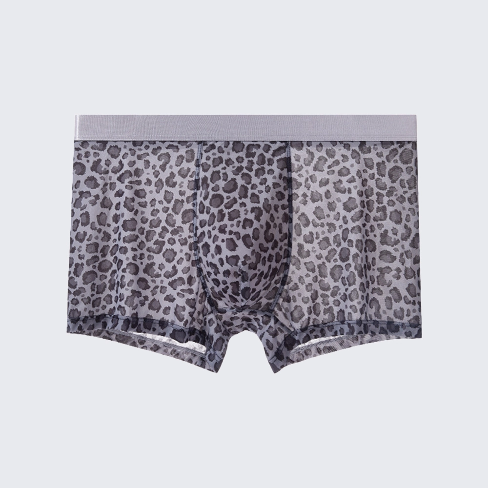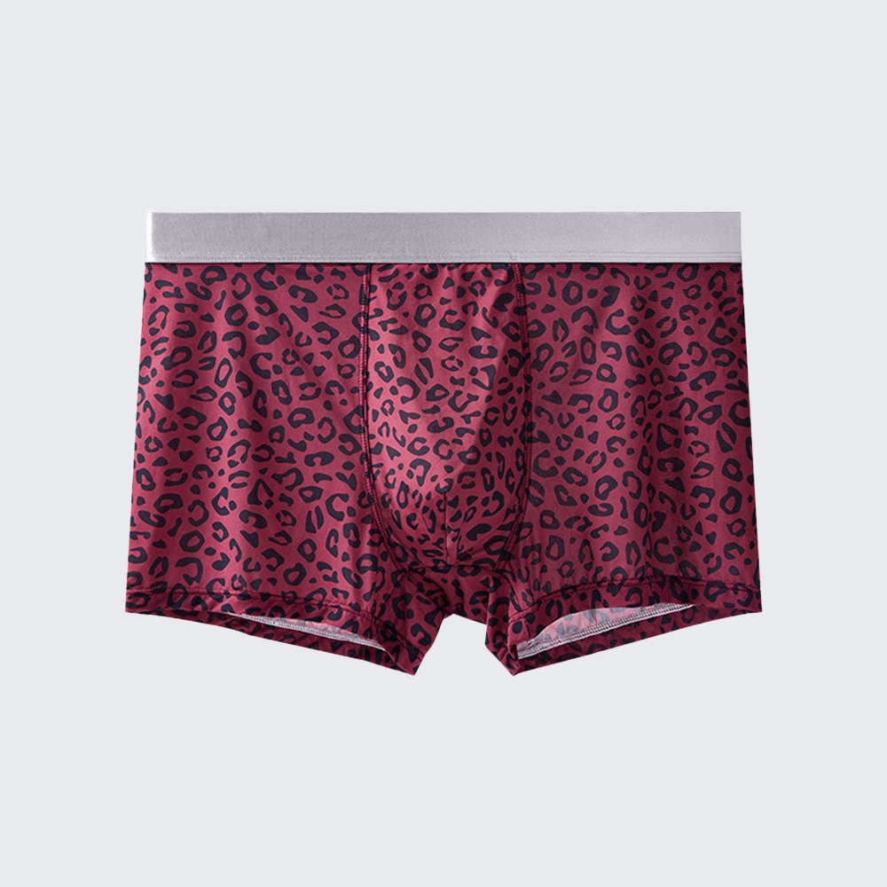 These men's low rise leopard print boxer briefs feature a mulberry silk crotch, offering a sexy, breathable fit for all-day comfort.